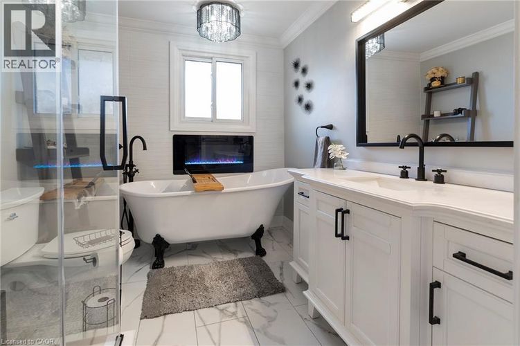 MOVE-IN READY! Looking for an UPDATED 4-bed, 2-bath beauty in a 10++ location? This is THE ONE! Prepare to be wowed by the natural light that fills every corner of this home, perfectly blending functional living with modern luxury. The main floor features an ideal open-concept layout, perfect for gatherings with family and friends. The newly renovated kitchen is a dream for any home chef, showcasing high-end stainless steel appliances, quartz countertops with plenty of prep space, and an abundance of modern cabinetry for all your storage needs. The extra-large island is the true centerpiece—offering additional seating, prep space, and storage. The second level offers three spacious bedrooms and a stunning 4-piece spa-like bathroom complete with a rare clawfoot tub, separate glass shower, and radiant heated floors so you’ll never have chilly feet. The lower level provides even more living space for the whole family to enjoy. Relax in the cozy recreation room with a wood-burning fireplace, perfect for games or movie nights, plus a bonus office area for working from home. Want to elevate your movie experience? Enjoy your own private theatre setup with a projector and theatre seating—no more crowded or expensive movie nights out. Step outside to your private backyard oasis, beautifully landscaped and designed for relaxation and entertaining. It features an interlocking brick patio with ample seating, plus an extra-large concrete deck with a gazebo, allowing you to enjoy the outdoors in any weather. Whether it’s morning coffee, evening wine, or hosting friends and family, this outdoor space is truly fantastic. There’s also a shed for all your outdoor storage needs. This home checks ALL the boxes—don’t miss it! Located in a sought-after neighbourhood close to parks, schools, and all conveniences. (id:26452)