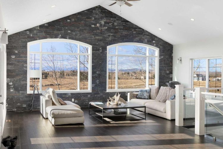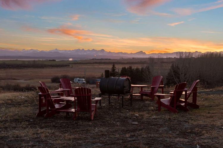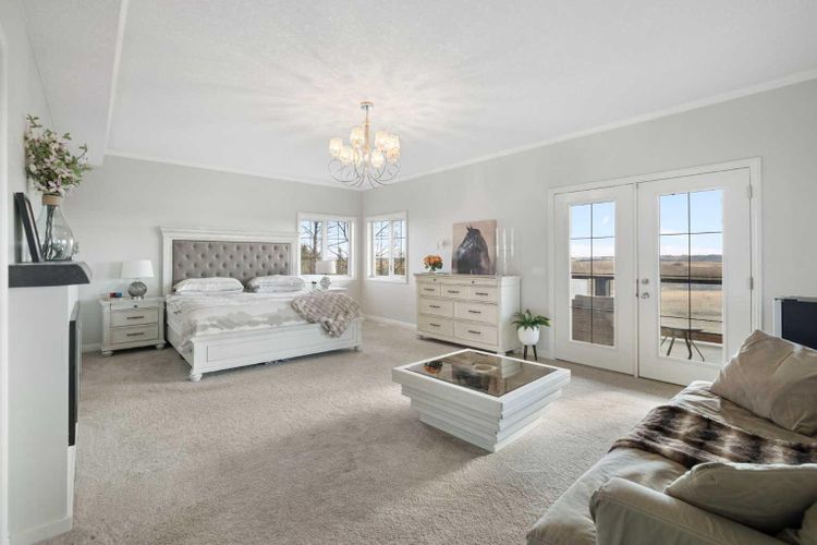 A lifestyle most only dream of! Historic Rocky Mountain views - just 8 minutes to Cochrane! Gorgeous custom-designed two-storey home featuring 4 bedrooms and 3.5 baths, with over 4900 sqft of developed living, AND 1,200 sq.ft. of wraparound decking on two levels.The main floor offers a smart, functional layout with three spacious bedrooms, including a massive primary retreat complete with a huge walk-in closet and luxurious 4-piece ensuite. Two additional bedrooms share another 4-piece bathroom with convenient main-floor laundry.Upstairs, the panoramic mountain views steal the show. The open-concept living space features 20-ft beamed ceilings, a cozy fireplace with built-in bench seating, and direct access to the south-facing deck. The chef-inspired kitchen showcases a full-size Sub-Zero fridge and freezer, granite island with seating, pot-filler over a Wolf six-burner gas range, walk-in pantry, and thoughtful design for everyday family life or large gatherings. The dining area, surrounded by three walls of windows, opens through French doors to another expansive deck — perfect for entertaining or soaking up the scenery.The walkout lower level expands your living options with a spacious one-bedroom suite (approx. 1,450 sq.ft.) featuring an open kitchen, dining, and living area, plus a media room/office, 3-piece bath, and laundry. A private entry makes it ideal for extended family, a caregiver, and successful short/long-term rental income. An interior locking door provides flexibility and security. Lots of options here.The oversized two-storey heated garage with attached carport ensures ample parking and storage.Outdoors, this fully fenced property includes manual entry gates, a quonset, and a charming barn with box and standing stalls, tack room, and loft (no power). Multiple paddocks, pastures with auto-waterers, two horse shelters, and a fenced dog run complete the setup.Enjoy peaceful rural living just minutes from Cochrane — with school bus service, shopping, and entertainment nearby. A short drive takes you to the Rockies and Alberta’s best outdoor playground.Book your private viewing today — this property truly needs to be experienced in person. (id:26452)