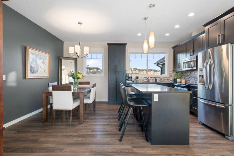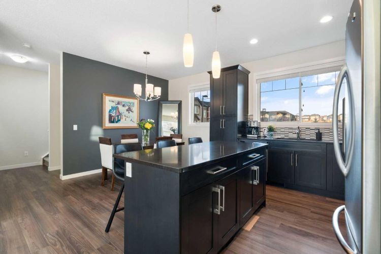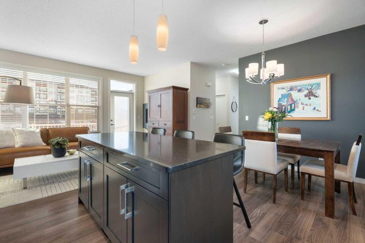 Welcome to this beautifully maintained, move-in-ready townhouse located in the sought-after community of Nolan Hill. Ideally positioned backing south onto a tranquil nature reserve with scenic ravine views, this home offers an exceptional blend of space, comfort, and convenience. With over 1700 sq ft of well-designed living space, the property features a double attached heated garage, air conditioning, three bedrooms, and two and a half baths, making it an ideal choice for today’s modern lifestyle. The inviting front entry opens to a spacious and flexible main-floor family room that easily adapts to your lifestyle. Whether used as a family room, home office, study, playroom, or fitness space, it enjoys sunny south-facing windows and walk-out access to a private patio and green space beyond. Upstairs, the second level impresses with 9-foot ceilings and an open-concept layout ideal for both entertaining and daily living. Wide-plank laminate flooring flows throughout, while the gourmet kitchen shines with stainless steel appliances, generous cabinetry, granite countertops, and a large centre island perfect for meals and gatherings. A roomy dining area connects seamlessly to the bright and airy living room, complete with large windows and a cozy wall-mounted gas fireplace. Step out through the patio door to the sun-soaked south-facing balcony with a gas BBQ line and beautiful ravine views. This level also includes a convenient 2-piece bath and additional storage. The upper level offers 3 well-sized bedrooms, including a comfortable primary retreat with a walk-in closet and private 3-piece ensuite. A 4-piece main bath and upstairs laundry complete this level, making everyday routines effortless. Additional highlights include noise-cancelling exterior walls and a prime location within the complex facing a green space and shared with only three adjoining units, creating a quiet and private setting. The pet-friendly complex allows pets with board approval. A newly announced K-4 school adds even more appeal to the community. Recent exterior updates include brand new shingles throughout, along with partial replacement of siding, eaves, downspouts, and fascia where hail damage was present. Enjoy a superb location within walking distance to the Gates of Nolan Hill shopping plaza, minutes to Sage Hill Crossing and Beacon Hill Shopping Centre, close to area schools, and offering quick access to Shaganappi, Sarcee, and Stoney Trail. Miles of pathways and park space are right outside your door. This is maintenance-free living at its best. Book your private showing today! (id:26452)