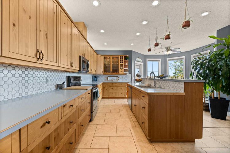 If you’ve been searching for a spacious country home with room for extended family, space for your animals, and breathtaking views of the coulee, this home with over 5200 square feet of living area is it! From the moment you step onto the inviting front deck overlooking the beautifully landscaped yard, you’ll feel at home. Inside, gleaming maple hardwood floors lead you into a sunken living room with a cozy wood-burning fireplace. The formal dining room flows seamlessly into a large kitchen featuring a central island with eating bar, stainless steel appliances, and a sunny breakfast nook framed by bay windows. Step out onto the wrap-around rear deck and enjoy sweeping views of the coulee—perfect for family meals and entertaining. The private owner’s retreat is a true sanctuary with a sitting area overlooking the coulee, a large walk-in closet, and a spa-like ensuite with a bubble jetted tub and separate shower. The main floor also includes three generously sized bedrooms, a 5-piece family bath with double vanity, a powder room, and a large laundry room complete with cabinetry, countertop, sink, and two walk-in pantries. The fully finished walkout basement offers incredible versatility with a private living space for extended family that includes its own kitchen, dining/sitting area, large bedroom with laundry-ready walk-in closet, a 4-piece bath, and patio access to the east yard. The rest of the lower level is designed for fun and functionality, with a media room, games room, craft/hobby workshop, and abundant storage. The entire basement can be used as part of the main house living space without any renovations needing to be completed. Outdoors, the fenced pasture with riding arena, two horse shelters, chicken coop with power and water, storage shed, dog run, and large garden provide everything you need for a country lifestyle. Extensively renovated in 2007, this home now boasts over 1,000 additional square feet, in-floor heat on both levels, high-efficiency furn ace, boiler with hot water storage, and a manifold plumbing system. Major updates include septic system replacement (2008), rebuilt front deck, new rear deck stairs and door, new garage door opener, lower-level kitchen installation, upgraded lighting and electrical, and numerous cosmetic updates such as flooring, window coverings, paint, and bathroom upgrades. Over 50 trees have also been planted, adding to the property’s beauty and privacy. This unique property combines comfort, functionality, and country charm—ready for you, your family, and your animals to enjoy for years to come. (id:26452)