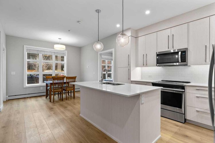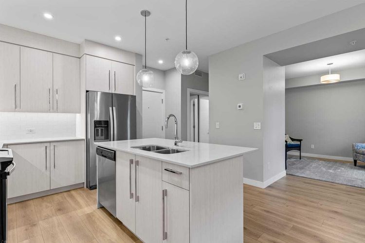 Catch the open house Valentine's Day Feb 14: 1-3pm or Sunday Feb 15: 4-6pm. Enjoy maintenance-free living in this spacious one-bedroom condo in the sought-after 55+ Maple building, ideally located in Calgary’s vibrant University District. Built by Truman Homes, Maple offers a secure, social community with luxury finishes, perfect for those ready to simplify life without sacrificing lifestyle.Unit 107 is a convenient main-floor condo with direct access to the covered patio and walking paths; ideal for easy comings and goings or running a quick errand. This 728 sq ft home features an open-concept floorplan with 9-foot ceilings, engineered hardwood flooring, and large triple pane picturesque windows. The modern kitchen includes quartz countertops, stylish cabinetry, a designer backsplash, and stainless steel appliances. The large island is perfect for casual meals or prepping a beautiful dinner at home. The dining area is spacious and also great for hosting family visits or playing cards with the grandchildren. The kitchen and dining area open to the living room, creating a comfortable space to relax at the end of the day. The generously sized bedroom includes a walk-through closet and a spacious 4-piece ensuite. A second full bathroom adds extra convenience for any guests. This unit also includes in-suite laundry and your own titled, heated underground parking stall.The Maple building includes a heated underground parkade, plenty of visitor parking, elevators, and thoughtful “aging in place” features such as wide hallways, accessible entrances, and automated doors. Residents will also enjoy a beautifully landscaped courtyard with inviting seating areas.Living in the University District makes everyday life incredibly convenient. From groceries and banking to coffee dates and evening movies, everything is close by. Save-On-Foods, Staples, Shoppers Drug Mart, Cineplex, COBS Bread, Monogram Coffee, Market Mall, and a variety of cafés, restaurants, and shops along Main Street are all within easy walking distance. With more amenities opening all the time, the University District continues to stand out as one of Calgary’s most vibrant and walkable communities.Next door is Cambridge Manor, a neighbouring residence offering independent and supportive living services. Maple residents are able to access select lifestyle and recreation amenities at Cambridge, including a bistro café, fitness centre, and a variety of fitness classes. A hair salon is also available, along with organized social activities such as coffee club, card games, crib club, drum circles, concerts, movies and documentaries, and special holiday meals.Whether you’re looking for a lock-and-leave lifestyle or a welcoming community to enjoy year-round, Unit 107 at Maple is an outstanding opportunity in one of Calgary’s best urban neighbourhoods. (id:26452)