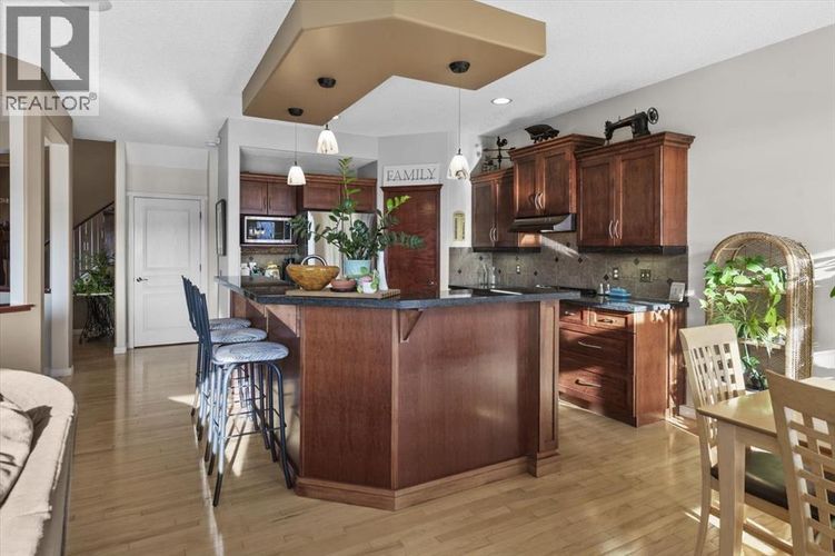 Tucked along one of Tuscany's most coveted ridge-lines, this home rewards you with something few homes can offer - unobstructed, sweeping views stretching from the city skyline to Canada Olympic Park and onward to the Rocky Mountains. By day, the panorama shifts with the light; by evening, the lights from the city and COP glimmer in a display that never grows old. Homes along this ridge rarely come to market, and it's easy to understand why. A vaulted foyer sets a gracious first impression, with extensive hardwood flooring flowing through the main level. A versatile flex room near the entry invites use as a den or intimate formal dining space. As you move toward the rear of the home, the floor plan opens up and that remarkable view commands your attention through expansive rear windows. The family room, warmed by a fireplace, frames the vista beautifully, while the kitchen stands ready for both everyday life and entertaining - rich maple cabinetry with under-cabinet lighting, granite countertops, a tiered island, and stainless steel appliances. A well-appointed main-floor mudroom keeps the household running smoothly with laundry facilities, built-in cabinetry, a folding counter, and laundry sink. Upstairs, a small loft overlooks the entry below - an ideal spot for a reading nook, homework station, or quiet workspace. The staircase splits to reveal thoughtfully separated sleeping quarters: a spacious secondary bedroom to one side, and on the other, a second secondary bedroom, full family bathroom, and the primary suite. Waking up to those mountain and city views from the primary bedroom is something truly special. The ensuite features dual sinks, a soaker tub, and separate shower, complemented by a walk-in closet. The walkout basement extends the living space with a large recreation room anchored by a gas wood stove, plus a bathroom featuring an oversized shower - perfectly suited for guests or post-hot tub evenings. Step outside and the backyard becomes your retreat: a hot tub with convenient hot water tap, patio, perennial gardens, an irrigation system, and storage shed. A gate opens directly onto the pathway system winding throughout Tuscany, inviting you to explore the coulee at your doorstep. Central air conditioning ensures comfort through summer, and a newer roof provides peace of mind. With a park and playground just steps away, this ridge-backing home on a quiet street delivers a lifestyle that families dream about - where stunning views, thoughtful design, and neighbourhood connectivity come together in one exceptional Tuscany address. (id:26452)