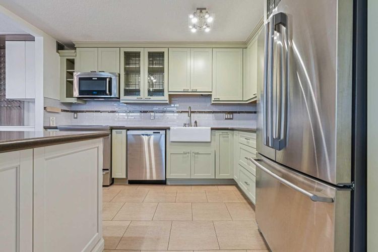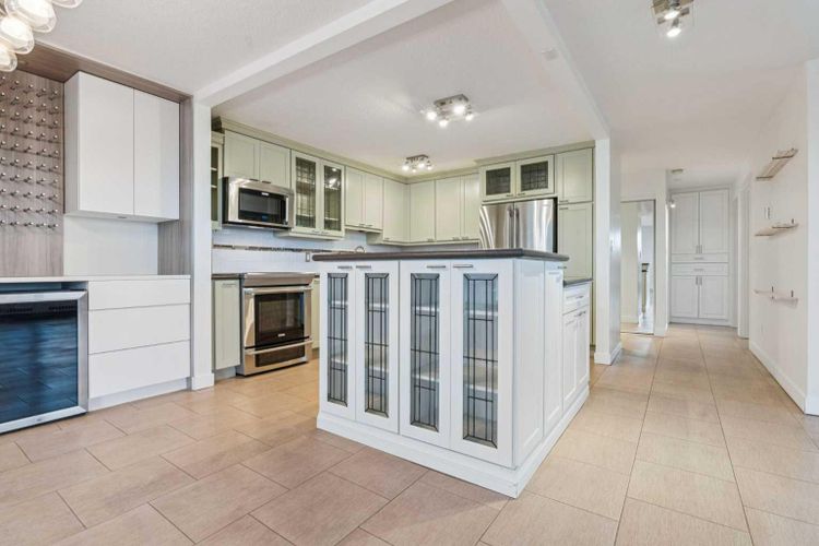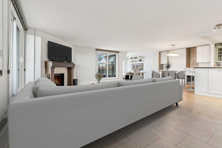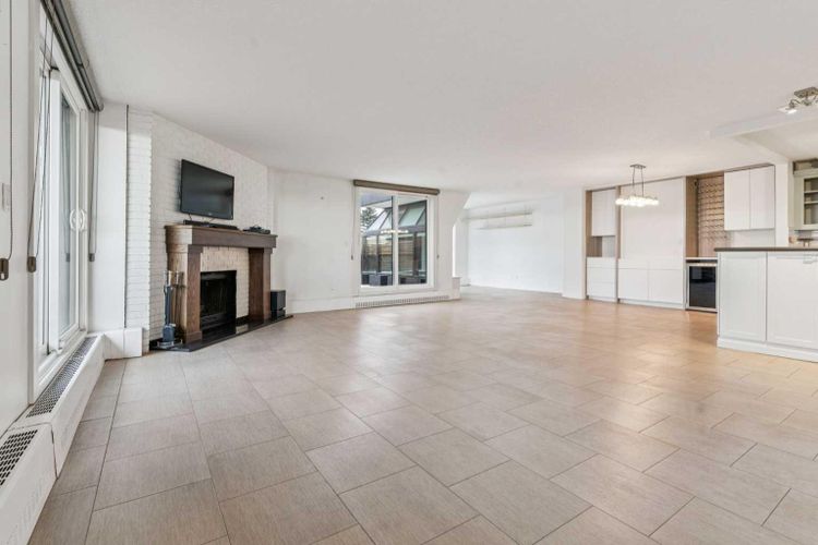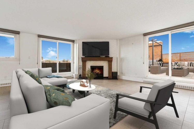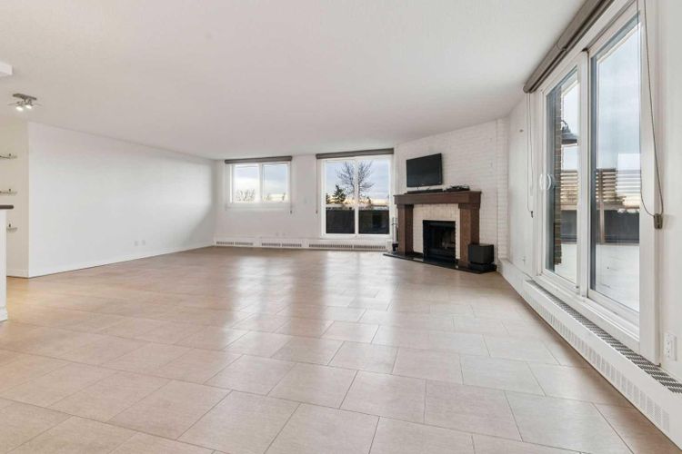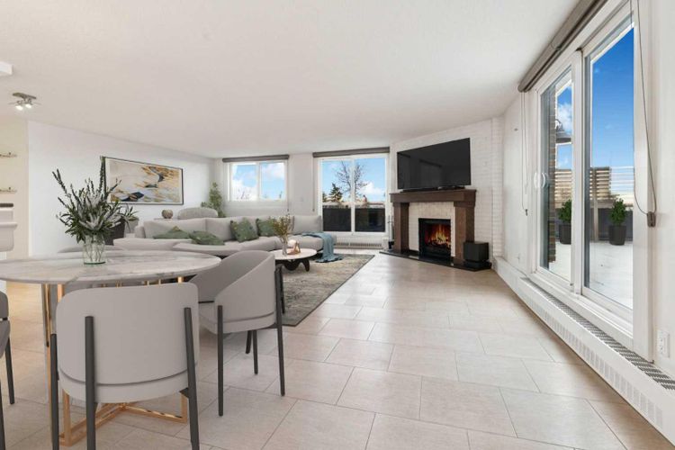 Welcome to an extraordinary top-floor retreat where refined indoor living meets unmatched outdoor space. Situated in a quiet concrete building, this impressive 1,500+ sq. ft. 2 bedroom, 2 bathroom home is finished to an exceptional standard throughout. The heart of the home is a custom Martha Stewart Living island kitchen, complete with stone countertops and premium Electrolux and Bosch appliances. It is very rare to find a custom kitchen of this size and quality! Beautiful appointed from top to bottom. It then flows seamlessly into a bright, open great room anchored by a cozy wood-burning fireplace. The space is very spacious with room for an additional library or seating area. Updated bathrooms, luxury vinyl tile and ceramic flooring, custom built-ins, double closets, and a large in-suite laundry room with abundant storage elevate everyday living. All of this as well as a very spacious office or studio space, solarium style with built-in, bench seating and a wall of windows. Mostly newer windows with custom blinds allow natural light to pour in from every angle. Step outside through two smooth-slide patio doors to a truly rare offering: a 700 sq. ft. penthouse-style wraparound rooftop patio. Designed for privacy and enjoyment, this outdoor oasis features a raised 24’ x 24’ deck with new wood feature walls. There is more unique spaces for dining, lounging or gardening! This patio is ideal for entertaining, BBQs, outdoor workouts, or simply relaxing while taking in sweeping southern sky views. Enjoy an easy-care executive lifestyle with two heated indoor parking stalls, a well-equipped fitness facility with sauna. Perfectly positioned on a peaceful, tree-lined street in the heart of revitalized Windsor Park, just steps to LRT, transit, Chinook Centre, shops, and restaurants. A short bike ride to Stanley Park, the Reservoir, and Elbow River pathways, and only 10 minutes to downtown. Condo fees include heat, water, and sewer. Immaculate, move-in ready, and truly o ne of a kind—this is elevated inner-city living at its finest. (id:26452)