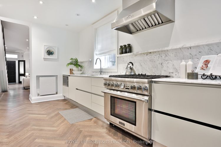This impeccably renovated 3-storey Victorian showcases exceptional quality & exquisite finishes throughout. The entry foyer opens to a stunning combined living & dining room flanked by 2 gorgeous fireplaces, nearly 10-foot soaring ceilings, herringbone hardwood floors & large windows.The gourmet Scavolini kitchen is the envy of amateur & professional chefs alike with generous Calcutta marble counter space, professional gas range, high end appliances & oversized pantry. The open concept family & breakfast rooms offer additional lounging, dining & work space with 2skylights & double sliding door walk-out to a tranquil City garden with ipe/teak deck & garage. The 2nd floor offers 2 spacious bedrooms one large enough to be the primary bedroom, renovated bathroom, open study area which could be a 4th bedroom & serene deck nestled in the tree tops. The beautifully reno'd Calcutta marble bathroom with soaker tub/shower, high-end fixtures & heated floors. The 3rd floor primary bedroom suite has a stunning 5-piece ensuite bath with separate water closet, large walk-in closet outfitted with Italian Poliform built-ins, sitting room, Juliette balcony & custom privacy door. The renovated lower level with media room, office or bedroom, another beautifully renovated 3-piece bathroom, laundry/utility room & abundant storage. There are 6 flat screen TV/Sonos systems throughout the home. This property offers an excellent investment opportunity & has generated over $550,000 in income over the past 6 years. Located in one of Toronto's most dynamic &culturally rich areas, steps from Queen West, Chinatown, Entertainment & Financial Districts & Kensington Market renowned for its eclectic mix of trendy boutiques, cafes, gourmet restaurants, vibrant nightlife, AGO, TTC, Grange Park, Ogden JR Public School and so much more.