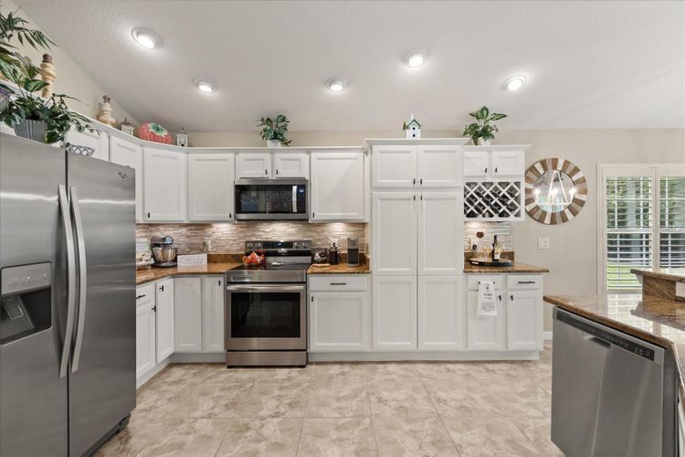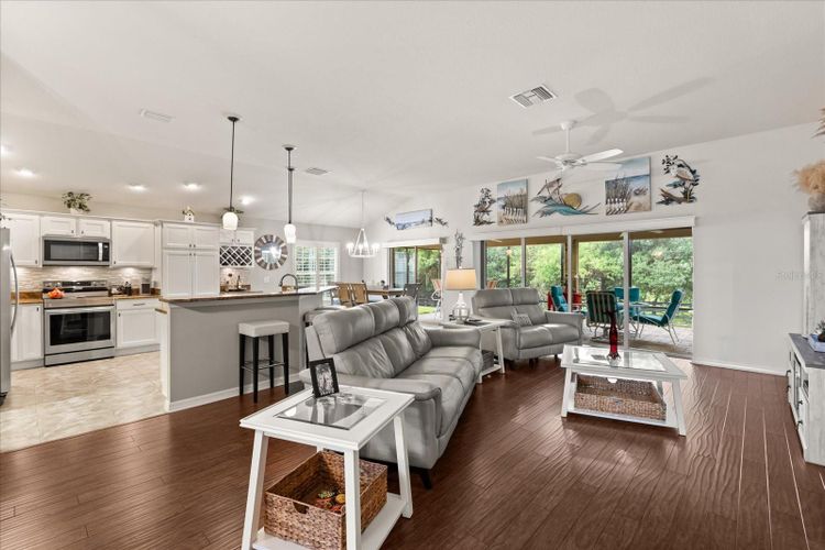 This beautiful home offers a rare combination of privacy, space, and resort-style living. Nestled on a pie-shaped homesite backing to a charming 4-board fence, there’s ample room for a future pool — and with a sneak-a-peek of Lake Miona, the view would be even more impressive with a pool or birdcage addition. The exterior features brick paver walkways, stacked stone accents, and low-maintenance landscaping with rock-filled flowerbeds. Inside, you’ll find large ceramic tile in the wet areas and wood laminate flooring throughout the rest of the home — no carpet — and plantation shutters on all windows. The kitchen is a showstopper, boasting white cabinetry with pullouts, stainless steel appliances (including a glass-top range), granite countertops, tile backsplash, under-cabinet lighting, and stylish pendant lights. The primary suite offers a tray ceiling and a spa-like bath with dual vanities and a walk-in shower. Pocket sliders lead to an oversized lanai with brick paver flooring and an added birdcage, perfect for soaking up the Florida sun. Remote controlled power blinds are located on all of the sliders. The extended 2-car garage — an extra 4 feet forward — provides plenty of space for vehicles, golf carts, and more. Located in Lakeside Landings, a sought-after gated community just minutes from The Villages and Lake Miona, residents enjoy an impressive array of amenities: a 13,000+ sq. ft. clubhouse, resort-style pool and spa, fitness center, pickleball and tennis courts, bocce ball, putting green, and a private beach with dock access to Lake Miona. There’s also a dog park, walking trails, and an active social calendar, making it easy to enjoy the Florida lifestyle to the fullest.