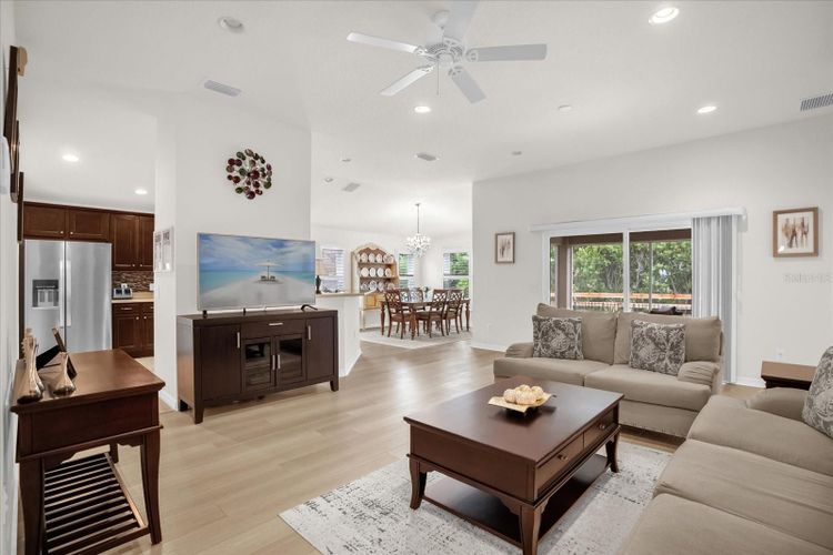 Welcome to the resort-style, maintenance-free community of Lakeside Landings! This gated, family-friendly neighborhood, The Villages, offers an incredible lifestyle filled with comfort and fun. This immaculate 3-bedroom, 2-bathroom single-story home welcomes you with great curb appeal, professional landscaping, and a large covered entry. Inside, you’ll find an inviting open floor plan with hardwood luxury vinyl flooring throughout—no carpet! The well-appointed kitchen features custom cabinetry, ample counter space, abundant storage, and new appliances. The spacious primary suite offers a walk-in closet and ensuite bath, while split bedrooms ensure added privacy for family or guests. Enjoy outdoor living on the extra-large back patio, and take advantage of the 2-car garage for convenience and storage. Residents enjoy access to an impressive 13,000 sq. ft. clubhouse featuring a huge resort-style pool, fitness center, billiards and card rooms, and a library. Host your special occasions in the elegant banquet hall complete with a dance floor and catering kitchen. Outdoor amenities include a spa, cabana, putting green, tennis and pickleball courts, and a playground for the little ones—plus a full calendar of community activities! This beautiful home perfectly combines low-maintenance living with resort-style amenities—offering the best of Florida living at Lakeside Landings!