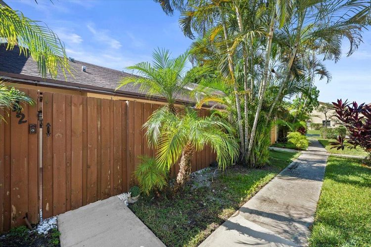 Beautiful 2/2 villa in a prime Palm Beach County location. Enjoy a private fenced patio with shutters, vaulted ceilings in the living/dining area and primary bedroom, and wood-look tile flooring throughout. Split floor plan, two closets in primary bedroom, plus a dedicated laundry room with washer & dryer. Includes two assigned parking spaces. Community amenities include clubhouse, pool, tennis, new fitness center and pickleball courts. Security cameras, night patrol, and on-site property manager. Close to shopping, dining, and major routes.