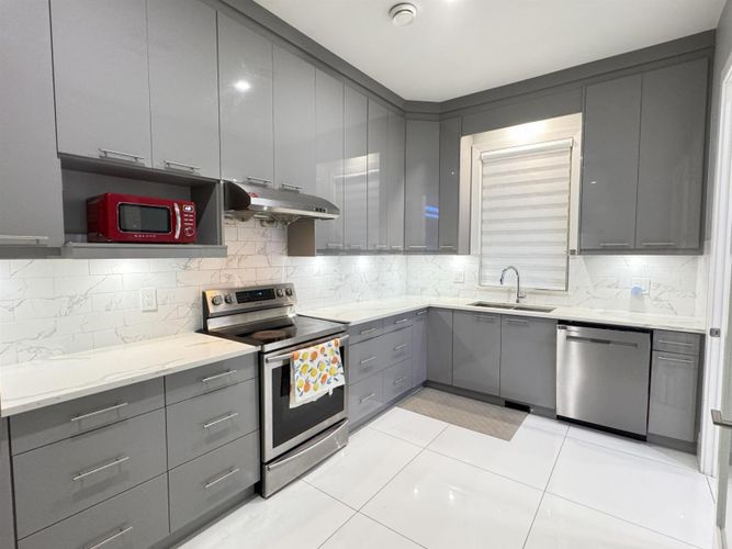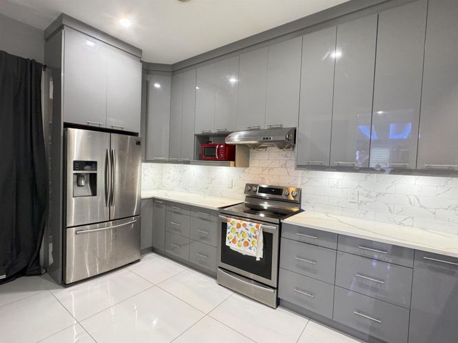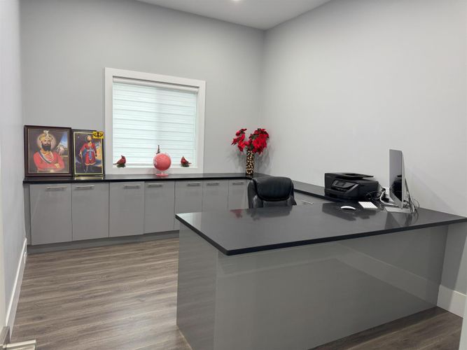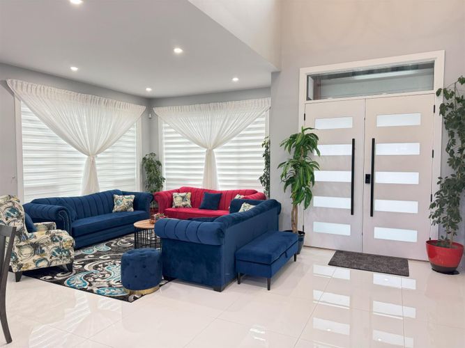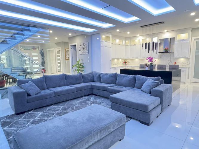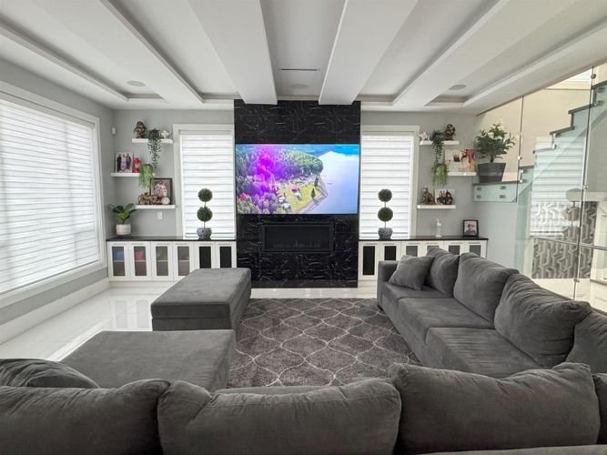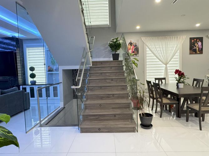 Custom-built spacious home offering luxury, functionality & exceptional design with 3 laundries. The main floor features 10-foot ceilings, a spacious living, dining, and family area, an oversized kitchen with a spice kitchen, a master bedroom with an ensuite and two walk-in closets, an office with custom cabinetry, and a full bathroom. The upper floor boasts a grand master suite with a designer ensuite and walk-in closet, plus four additional bedrooms with private ensuites and walk-in closets. The basement includes a media room, sauna, full bathroom, mudroom, and two rental suites (2-bedroom and 1-bedroom) with excellent tenants. Situated on a corner lot with a large storage shed, it also offers backyard access with a sliding gate for RV parking and a beautifully landscaped outdoor space.