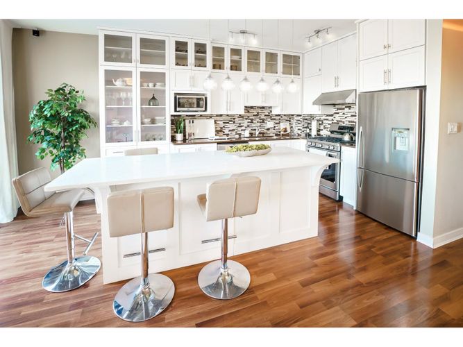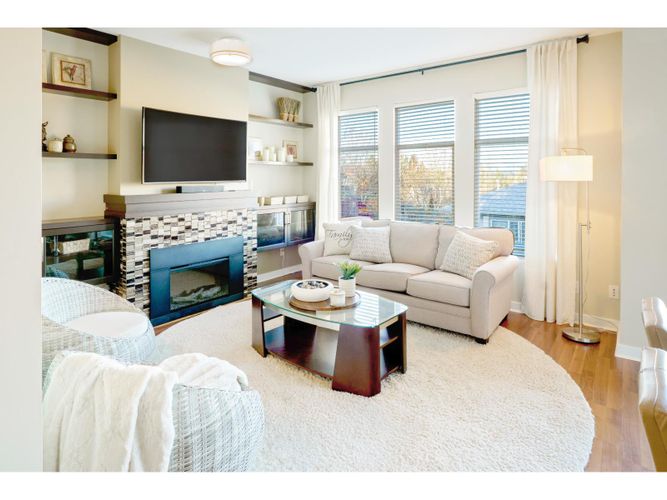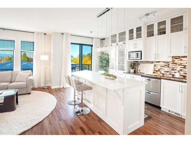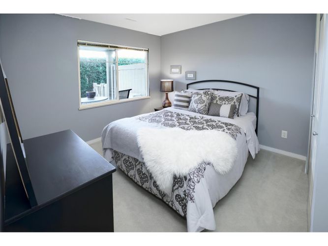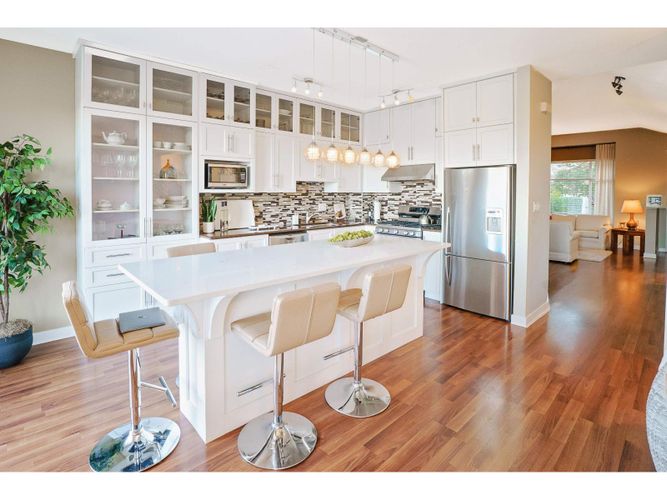 Gorgeous Townhouse stunning rancher w/ a walkout deck offers breathtaking views of the North Shore mountains, featuring a spacious main living area that seamlessly connects to a large patio. Perfect for indoor/outdoor entertaining & summer barbecues. Enjoy the charm of a the small garden area & the convenience of a double car garage. Inside, vaulted ceilings & built-in cabinets enhancing the elegant ambiance. Customized gas fireplace w/ beautiful stonework adds a cozy touch. The professionally designed kitchen boasts white stainless steel Fisher & Paykel appliances, a double drawer dishwasher, expansive quartz countertops, & under-mount cabinet lighting, entertainers island making this a chef's dream. This complex offers exceptional amenities and a beautiful move ready townhouse.