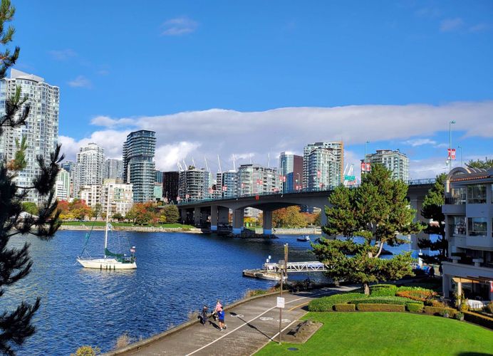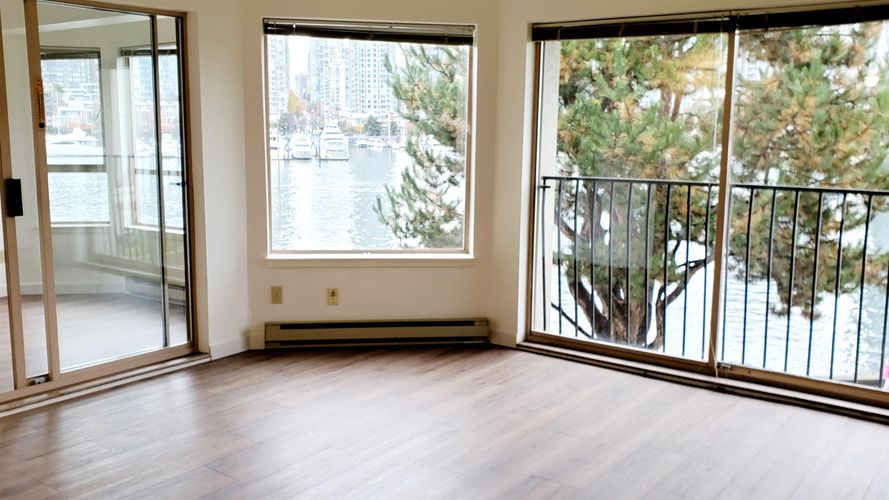 WATERFRONT, Rare, Panoramic WATER VIEW, False Creek, downtown scenic skyline! San Remo Court at The Regatta. Gorgeous Water views from living room, den, master bedroom & outdoor balcony! Floor to ceiling windows! Seawall. Rare Freehold home in this part of False Creek! Spacious 1173 sq ft- 2 bedroom & huge flex/den, large kitchen, walk-in closet, balcony, gas f/p, 1 parking (#54), 1 locker (#25. Room-1). Excellent fac- indoor pool, hot tub, sauna, steam rm, caretaker, ping pong, gym, clubhouse, 2 pets ok, lots of visitors parking, EV charging, minutes to downtown, city hall, Olympic Village, Canada Line skytrain station, Aqua bus to Yaletown & Granville Island. See video in VTour Link. Professionally painted, cleaned and new laminate floors. Priced below BC Assessment- $1.282 million.