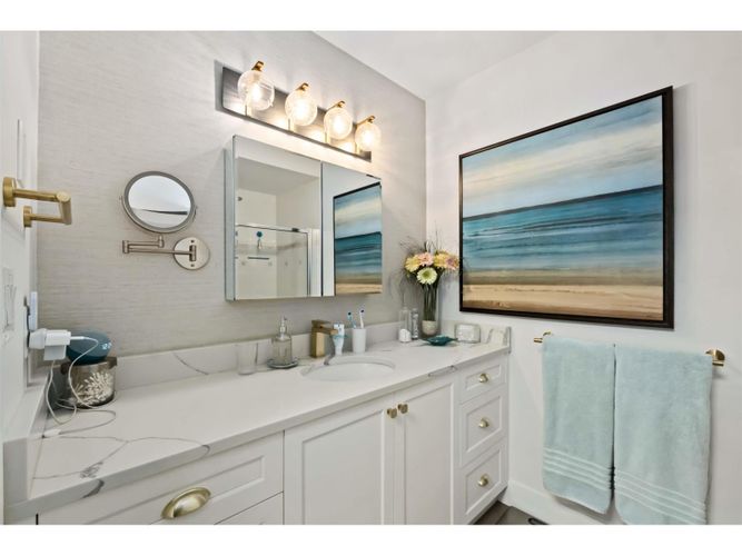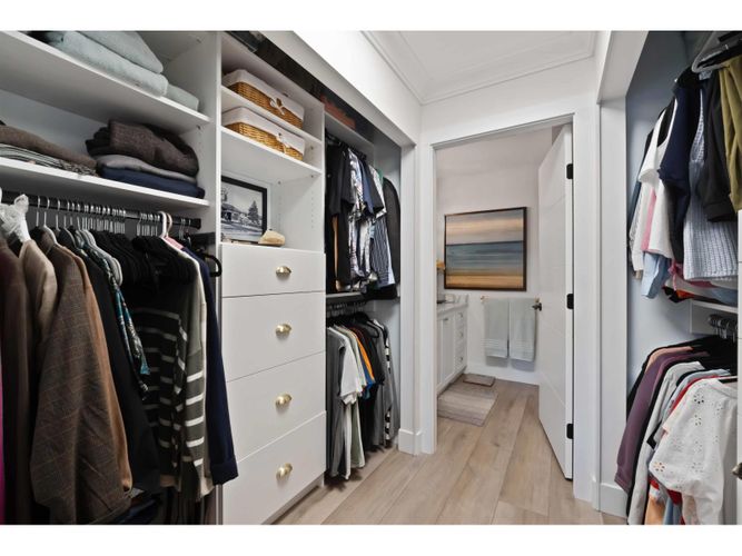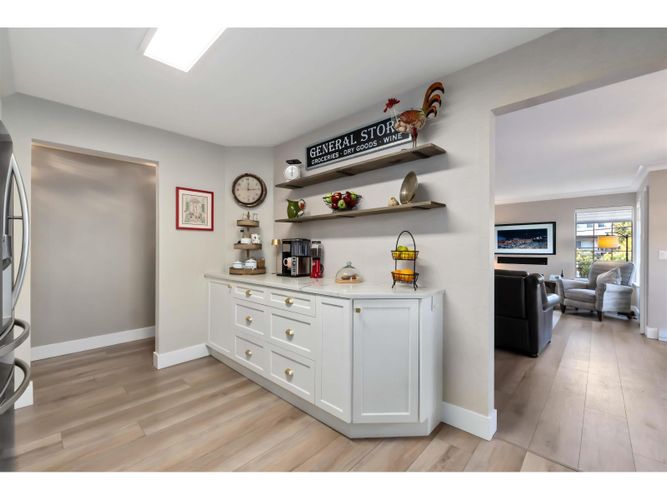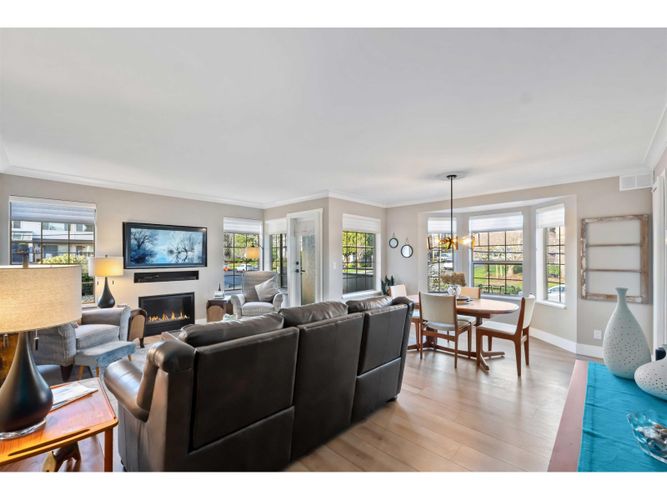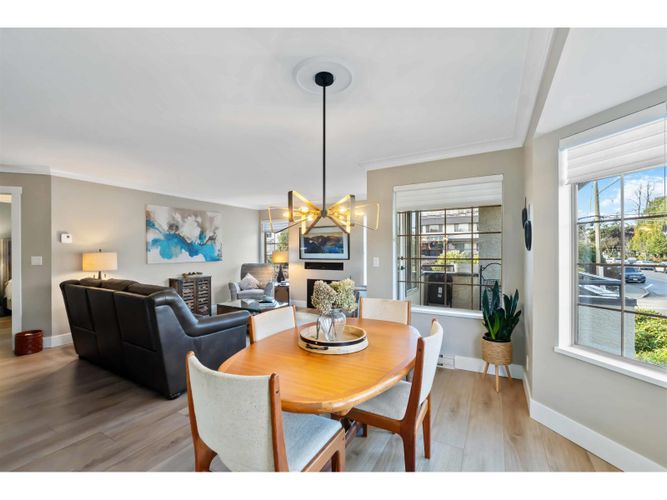 Welcome to Brockton Place! This immaculate ONE OF A KIND remodelled 1,200 sq ft corner in a well-run, sought-after community of just 17 residences. Minutes from White Rock Beach, this bright and spacious 2-bed, 2-bath layout is filled with natural light and features a full utility room with in-suite laundry. Enjoy summer breezes from two private balconies off the living and dining rooms. Extensive updates include a $35K kitchen remodel with quartz counters, new LG appliances and under-cabinet lighting, luxury vinyl flooring, crown mouldings, Hunter Douglas blinds, LED lighting, custom closets, updated fireplace, new hot water tank, heaters, stylish barn doors, baths, and lots more. Steps to elevator, stairs, transit, shops, hospital, and uptown White Rock, everything you need is close by!