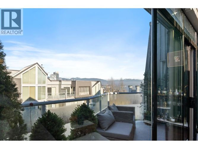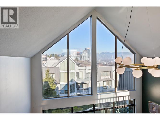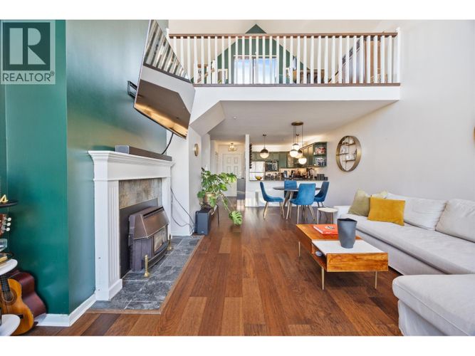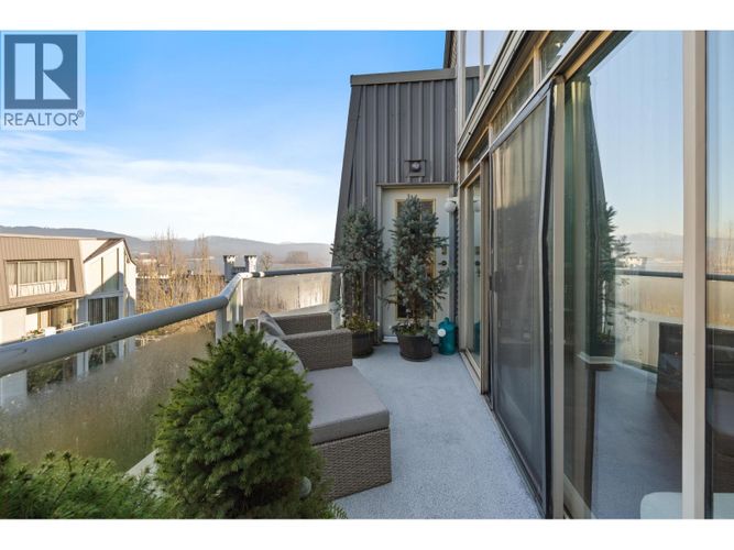 Rare Penthouse Loft with Double-Height Living, designer finishes & parkside setting. An architectural, design-forward 2 bed layout w/engineered hardwood floors showcasing vaulted ceilings, oversized windows, and gas fireplace. CB2 sculptural brass ring chandelier & fixtures, stone counters, solid oak kitchen cabinets, and much more. Outdoor space includes a south-facing sundeck with river views plus a north-facing balcony overlooking landscaped grounds. Garden-facing primary offers a custom walk-in closet and full bath w/tub and separate shower. Rain-screened building. Gated parking, oversized storage locker, plus separate on-site RV/trailer/boat parking. Easy walk to SkyTrain, Royal Columbian Hospital, Queens Park, and shopping.