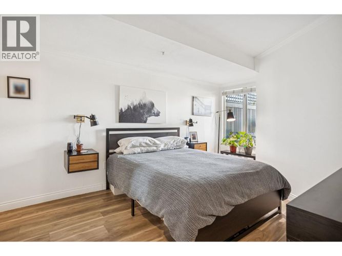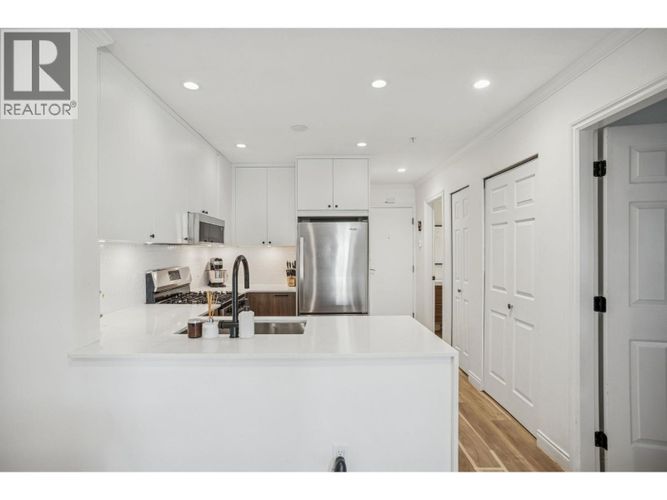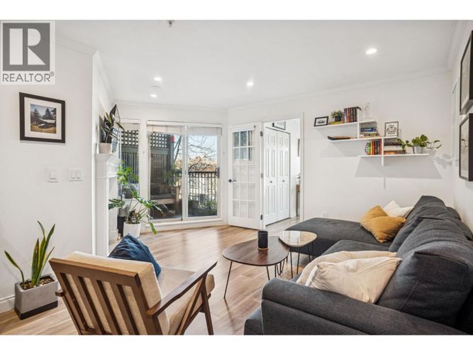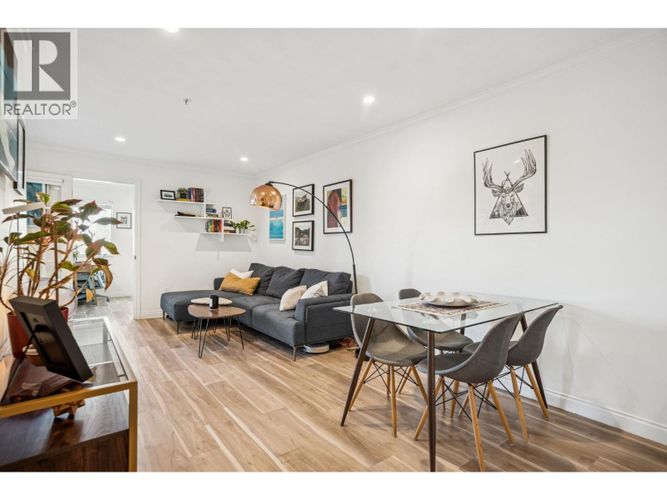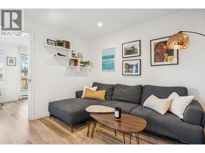 Welcome to Vintage Eastside in the heart of Fraser. This beautifully renovated north-facing home offers a quiet, light-filled interior. The kitchen features custom wood cabinetry with soft-close hardware, waterfall quartz countertops, stainless steel appliances with a gas range, and a honeycomb backsplash. Wide-plank vinyl flooring, smooth ceilings, and recessed lighting complete the modern feel. The smart layout offers separated bedrooms, a cozy gas fireplace, bright living space, and generous in-suite storage. Enjoy a private balcony ideal for summer BBQs. Well-maintained, fully rainscreened building with EV charging, bike storage, and a shared garden. Pet-friendly with 1parking stall. Steps to transit and walkable to Mount Pleasant's "Golden Trainagle"(Savio Volpe, Matchstick & more).