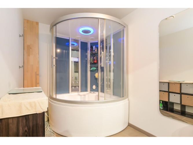 "LET THE GOOD TIMES ROLL" in this 2 Bdrm, 1 Bathrm over 900 sq ft Condo in Central Chwk. Relax in the Lvgrms high 1/2 barrel ceiling with Blt in movie projector, pull down screen & mood lighting. The stylish galley kitchen has butcher block counters, white appliances, soft close drawers, auto undermount lighting too. A modern 4 piece bathrm offers: a circular enclosure jetted tub/shower combination with blt in radio & sauna features, automatic lighting, wave style countertop basinless sink, overhead cabinets and tile flooring. The Primary Bdrm has a sliding door onto the long sundeck. Enjoy other features such as: curved hallway doors, entrance/hallway accent floor lighting, insuite laundry, outdoor hanging solar lighting, rolldown sun screens, all overlooking the common fenced greenspace. (id:26452)