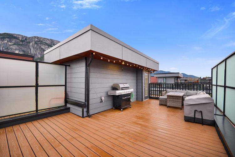 Modern Downtown Living at Lizzy Bay! This unique 3 bed + den, 2.5 bathrooms home offers the perfect blend of urban convenience and outdoor lifestyle. The multi-level floor plan features an open-concept main floor with high ceilings and a open-concept kitchen with a gas stove and large island. On level 2, find your bedrooms and another staircase leading to an incredible 319 SF rooftop patio. Includes 1 parking stall and 2 large storage lockers. Unbeatable Walkability: Steps from downtown shops, markets, and dining. Nature is at your doorstep with the estuary trails and oceanfront just a short stroll away. Includes gated parking, two storage lockers, and New Home Warranty. Experience the best of Squamish living in this rare, stylish townhome.