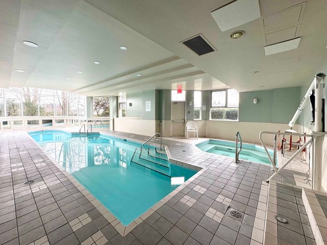 RIAINSCREENED AND REPIPED! GORGEOUS 2 BEDROOMS + 2 full BATHS unit with RIVER VIEW in quiet river front of New Wesminster. Facing peaceful water view. Updated and open kitchen features stainless appliances. Direct access from the builidng to the beautiful boardwalk. Walking distance to Sky train station, restaurants, and grocery stores. Bonus with 1 parking stall. This well managed building went though RAINSCREENED from 2002 to 2011 (exterior, roof, skylights, windows, balcony and terrace swing doors) and REPIPED in 2009! Great amenities including indoor pool, hot tub, sauna and gym! A worry-free, perfect place to relax and enjoy the life.