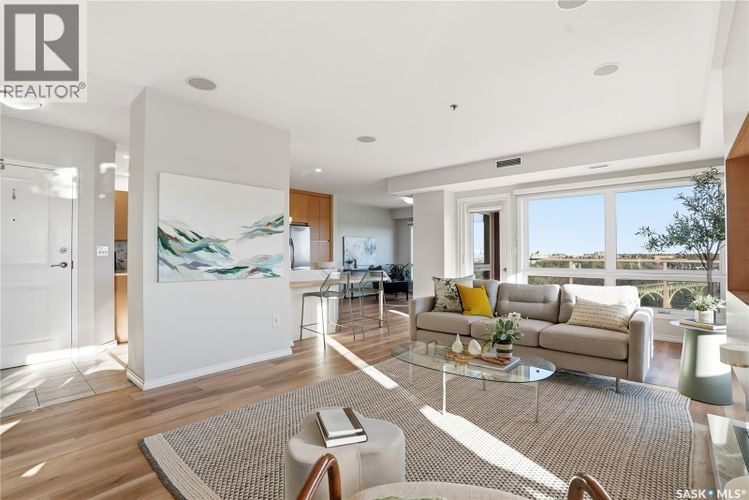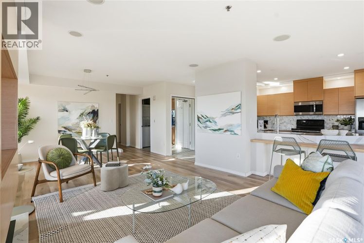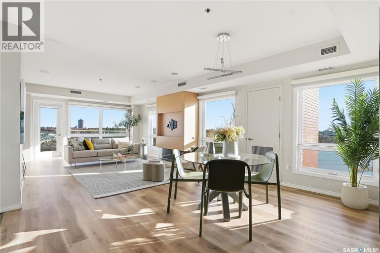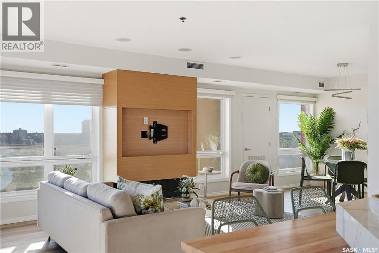 One of the best views in the city. This beautiful luxury condo has it all: a million dollar view, premium upgrades, and impressive size. Since its purchase in 2018 over $150,000 in renovations have been invested. Updates include a custom kitchen, a redesigned living room with fireplace feature wall, and modern bathroom cabinetry, lighting, blinds, built in shelving in the closets, luxury vinyl floors. Enjoy unmatched south and east-facing panoramic views from the wraparound deck, complete with upgraded tile flooring and a natural gas BBQ hookup. The gorgeous living room showcases sweeping views of the South Saskatchewan River from every angle, creating a bright and peaceful atmosphere. The modern kitchen features contemporary cabinetry, stylish countertops, a functional island, and stainless steel appliances,perfectly designed for both cooking and entertaining. Every room offers breathtaking views: use the sunny corner as your home office or a relaxing sitting area.The master bedroom includes a spacious walk-in closet and a stunning three-piece ensuite with a steam shower and heated tile floors for ultimate comfort. The second bedroom features a smart built-in desk within the closet, ideal for a work-from-home setup.Additional highlights include a built-in sound system throughout the unit and balcony, one underground parking stall, and a storage unit. The fireplace, originally gas, is now electric but can easily be reconnected to gas. This well-managed, quiet concrete building is pet-friendly (with Board approval) and offers top-tier amenities: a gym, amenities/meeting room, guest suites, on-site maintenance, and garbage chutes on every floor. Located in the heart of Downtown Saskatoon, you’ll enjoy front-row views of the city skyline, with walking access to the University of Saskatchewan, restaurants, hospitals, and river trails.Large windows throughout create a scenic, light-filled living experience the perfect blend of luxury, comfort, and location. (id:26452)