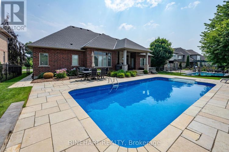 Welcome to 6968 Clayton Walk, a beautifully maintained all-brick bungalow tucked away in one of South London's most desirable communities. From the moment you arrive, the curb appeal impresses with its manicured landscaping, wide driveway, and stately double garage. Step inside and you are greeted by a bright and welcoming foyer with warm natural light, setting the tone for a home that feels both refined and inviting.The front office and formal dining room offer the perfect balance of function and elegance, while the heart of the home lies just beyond. Here, an open-concept living room with an indoor fireplace flows seamlessly into a stunning kitchen and breakfast area. Rich dark wood cabinetry, tiled floors, a central island, walk-in pantry, and generous storage make this space as practical as it is stylish.The main floor is thoughtfully laid out with a spacious laundry room, a 2-piece guest bath, and three large bedrooms. The primary suite is a true retreat, complete with a luxurious five-piece ensuite, walk-in wardrobe closet, and direct walkout to your private backyard oasis. The two additional bedrooms share a beautifully designed five-piece bathroom with dual access.Downstairs, the massive finished basement offers incredible versatility. A spacious rec room, wet bar, fitness area, and a fourth bedroom with its own three-piece bath provide the ideal layout for entertaining, relaxing, or accommodating guests in comfort.Step outside and enjoy a backyard built for summer living, featuring a low-maintenance yard, an in-ground swimming pool, a charming pool house, and an indoor-outdoor fireplace that creates a perfect atmosphere day or night. Surrounded by bike paths, top-rated schools, and just minutes to Lambeth, parks, and restaurants, this home truly has it all. And with professional property maintenance already covered for the rest of 2025, your time here is yours to enjoy. Don't miss out and book your showing today! (id:26452)