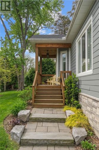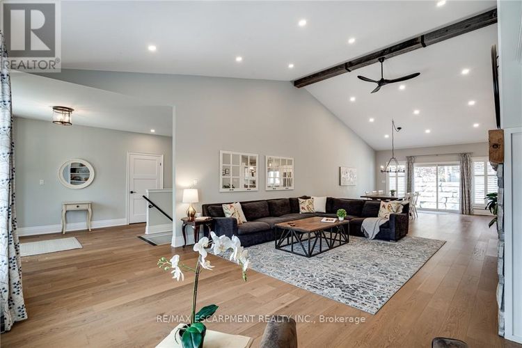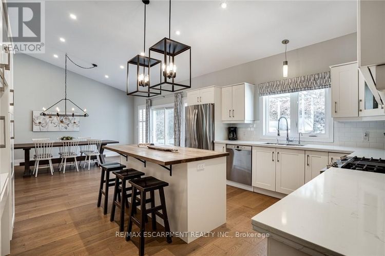 This remarkable custom-built bungalow is designed to impress, showcasing almost 3,400 square feet of finished living space with style and ease. Perfectly situated in the heart of Dundas, this home combines privacy with convenience just steps from scenic trails, top-rated schools, the arena, community centre, and charming downtown shops and dining. Inside, soaring vaulted ceilings, engineered hardwood floors and sun-filled open spaces create a welcoming atmosphere. The living room centers around a stunning gas fireplace with brick surround and rustic wood mantle, while the dining area flows seamlessly to the backyard perfect for entertaining. The gourmet kitchen is a chefs dream, complete with stainless steel appliances, a gas range, quartz countertops, abundant cabinetry, and a striking island with butcher block breakfast bar. The luxurious primary bedroom suite is your private retreat, featuring a spa-inspired ensuite, walk-in closet, and sliding glass doors leading directly to the backyard. Two additional bedrooms, a 4-piece bathroom, laundry, and inside access to the oversized 2-car garage complete the main level. The fully finished lower level expands your living options with a spacious L-shaped recreation room, a guest bedroom, 3-piece bath, and generous storage. Complete the wow factor when you step outside to your own backyard paradise: a two-tiered retreat with an inground pool, a large workshop/shed, and a wooded backdrop that offers both beauty and privacy. This is more than a house its a lifestyle. (id:26452)