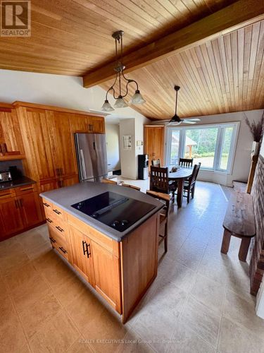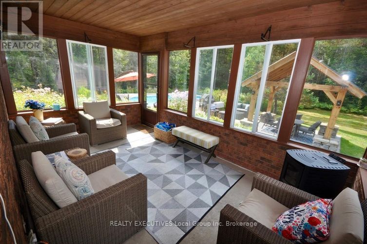 Welcome to this one-of-a-kind, 5-acre estate lot located within the city limits of North Bay, offering exceptional privacy, space, and lifestyle amenities. Nestled among mature trees and set well back from the road, this property is accessed via two paved driveways and offers a rare blend of seclusion and convenience. Step into the home through the bright sunroom overlooking the backyard pool area, and instantly feel the welcoming charm. The eat-in kitchen is well appointed, featuring cherry cabinetry, a brick fireplace, and warm country finishes. The living room is flooded with natural light from large windows and made cozy by a pellet stove, while the dining room is tastefully finished and looks out over the serene, private yard. The main-floor primary bedroom offers a quiet retreat with a 4-piece ensuite bath and its own sunroom, ideal for peaceful morning coffee or evening relaxation. Upstairs, you'll find two generously sized bedrooms, both with walk-in closets, a full 4-piece bathroom, and a separate wing with a flex room that can serve as a fifth bedroom, office, or studio. The lower level is designed for entertaining, featuring a live edge bar, a wine room, and a cozy rec room with a wood-burning fireplace. This level also includes a fourth bedroom, a 3-piece bath, and a cedar-lined sauna, adding a touch of luxury to everyday living. Step outside into your private summer oasis, complete with an in-ground pool, a gazebo, and a custom fire pit area, perfect for hosting or simply enjoying quiet evenings under the stars. Attached 2 car garage. Rounding out the property is a detached 40 x 40 garage with multiple overhead doors, ideal for a workshop, storage, or recreational use. A 20 x 20 bonus room within the garage adds even more flexible space for a studio, gym, or guest suite.Whether you're a family looking for room to grow, an outdoor enthusiast, or someone seeking a private retreat with city amenities, this incredible property has it all. (id:26452)