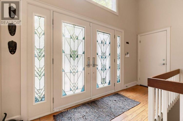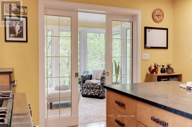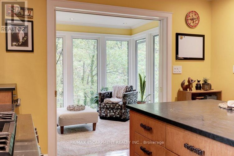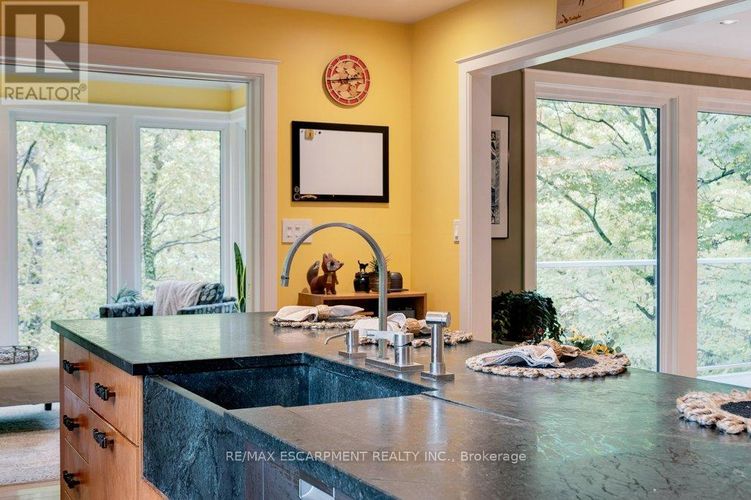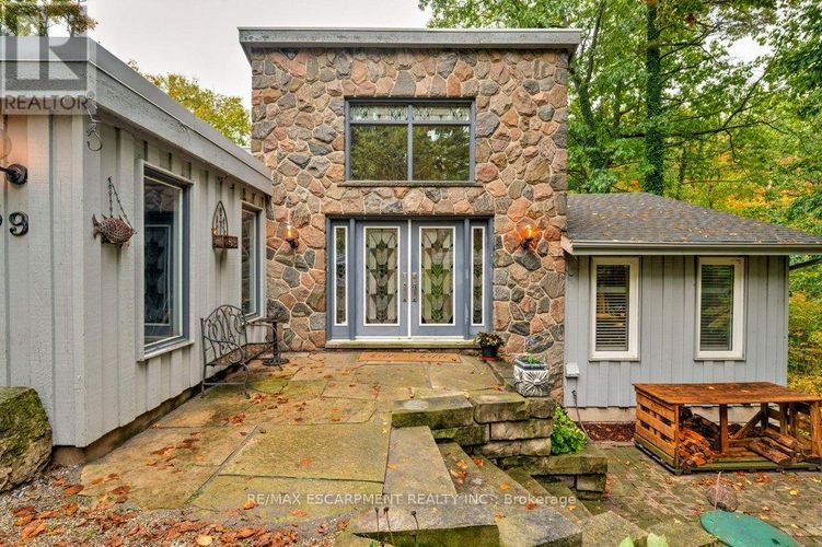 Welcome to this hidden sanctuary with breathtaking woodland views from every room in this home. This contemporary home is set on nearly 6 acres of forestry & completely immersed in nature's beautiful surroundings with secret waterfalls, a majestic stream & vibrant wildlife that animates the wilderness. Step inside and be greeted by an alluring & grand foyer with vaulted ceilings. The main level starts off with a spacious family room with a 3-way stone wood burning fireplace, Brazilian hardwood floors, & wall to wall windows to take in the incredible views. Next is the dream kitchen you've been waiting for that combines function with the perfect entertaining set up. This culinary haven features soapstone countertops, custom hardware, undermount lighting, a wet bar sink, a 10ft island, & top of the line appliances such as Thermador gas stove, steam oven & more. Adjacent to the kitchen is a cozy glassed-in sunroom with panoramic views of the lush forest & a balcony that stretches all along the back exterior of the home. The main level also offers a spa-like bathroom with a jetted bathtub and an infrared heat lamp to keep you warm and toasty. Beside is your primary bedroom with a walk-out to the balcony and a 12ft x 4ft closet with a window. Downstairs, find a rec room with another wood-burning fireplace and a full wall of windows for another spectacular view. 2 additional bedrooms, a 3-piece bathroom, a laundry room, & a one-of-a-kind office space with a walk-out to the backyard complete this level. The backyard includes a pizza oven and a hot tub, providing you with a space that boasts the utmost relaxation. This retreat is complete with an eight-car driveway, an EV charger and a one-car garage with inside entry. Located in one of Grimsby's most desirable areas, this remarkable property not only backs onto the Bruce trail & Grimsby Bench Nature Preserve but offers such a short distance to restaurants, highways & all other amenities. RSA. (id:26452)
