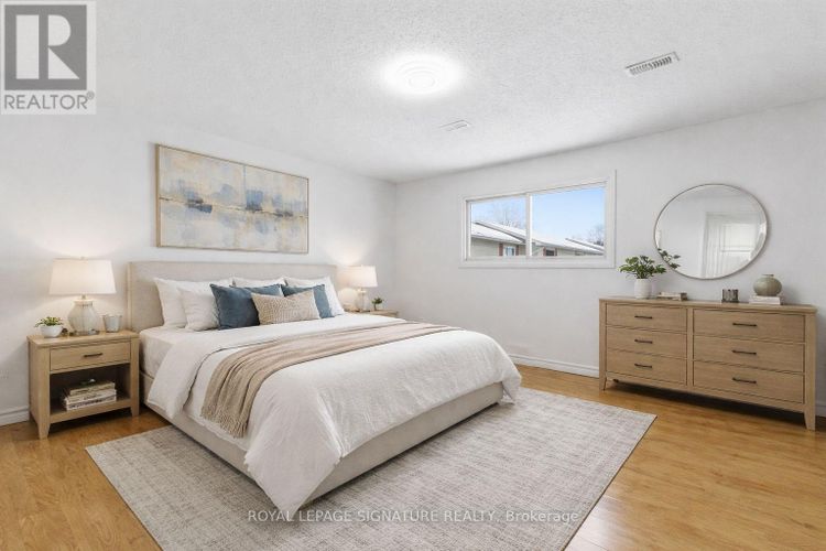 Make yourself at home in this bright and well-maintained end-unit townhome in a quiet, well-managed East London complex backing onto Genevieve Park. The main floor features a spacious open-concept living and dining area, convenient main-floor laundry, and an updated kitchen with stainless steel appliances, ample cabinetry, a breakfast nook, and walk-out access to the backyard, perfect for everyday living. The upper level offers three generously sized bedrooms, including a large primary bodroom, along with a full 4-piece bathroom. The finished lower level provides additional living space with a comfortable family room, den, second 4-piece bathroom, and plenty of storage, making this home ideal for families, professionals, or students seeking extra space. This move-in-ready townhome has been refreshed with fresh paint, new lighting, trim, and baseboards, and includes newer forced-air heating and cooling for year-round comfort. Conveniently located close to shopping, restaurants, medical services, public transit, parks, and schools. Just minutes to Fanshawe College and a short drive to Western University. Immediate possession available. Tenants to pay water, heating and hydro. Some photos are virtually staged. (id:26452)